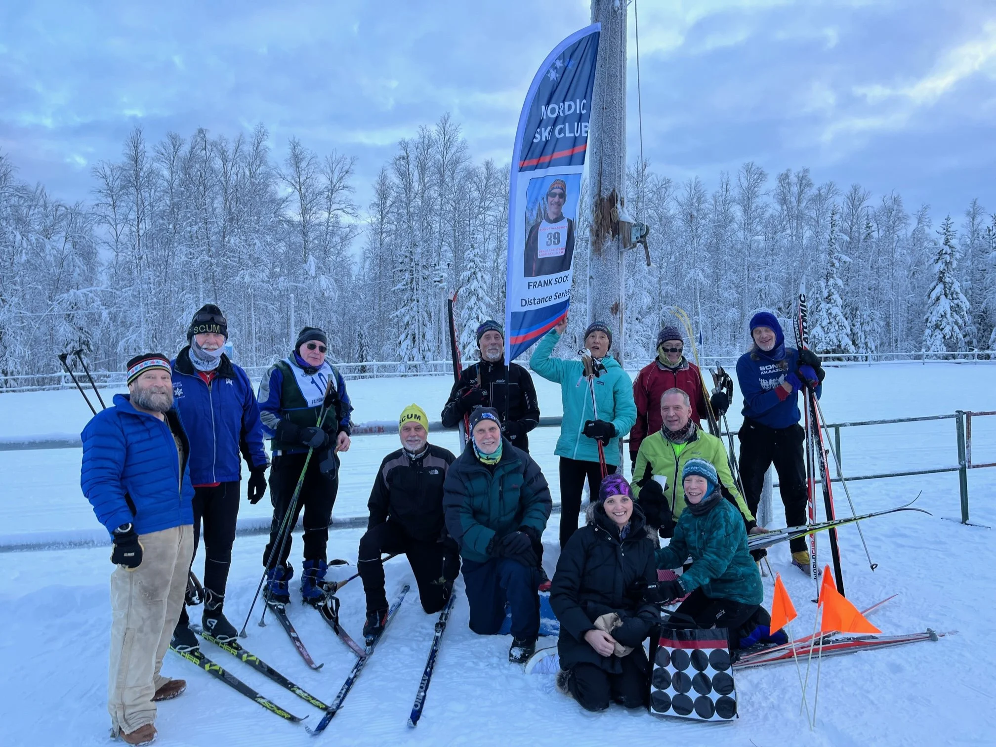 Some of the cross-country skiers known as SCUM assemble under the Frank Soos banner at the finish line of the Frank Soos memorial distance race Saturday afternoon at Birch Hill in Fairbanks. He was on everyone’s mind. (Photo by Dan Mullins)