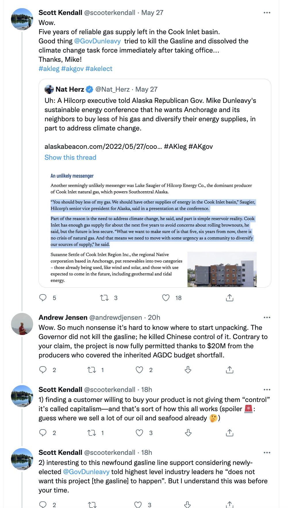 What follows is part of an extended harangue on Twitter Friday between Scott Kendall, former chief of staff to Bill Walker, and Jensen, the state employee and campaign spokesman.