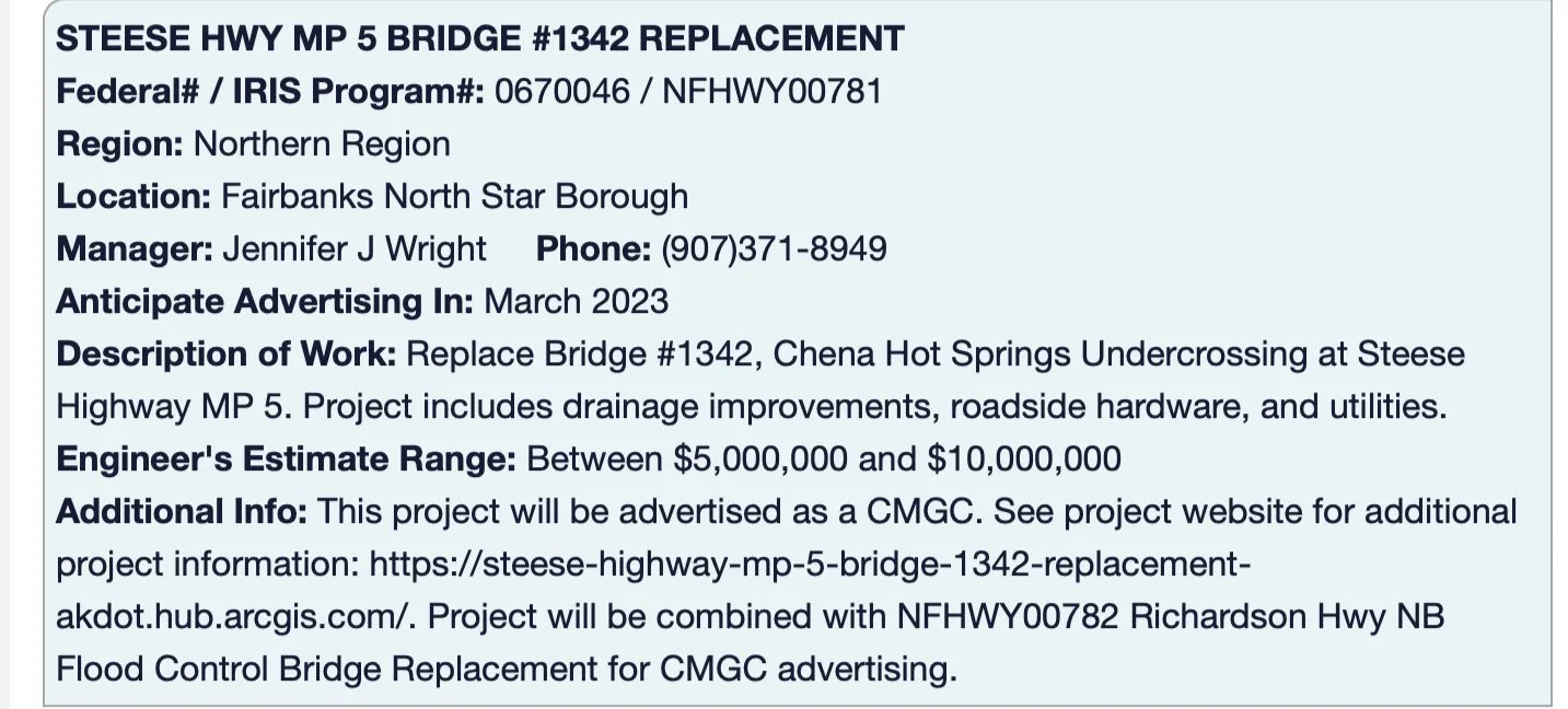 The most surprising of the Dunleavy projects is the $5 million to $10 million plan to replace the Steese Highway bridge at Chena Hot Springs Road.