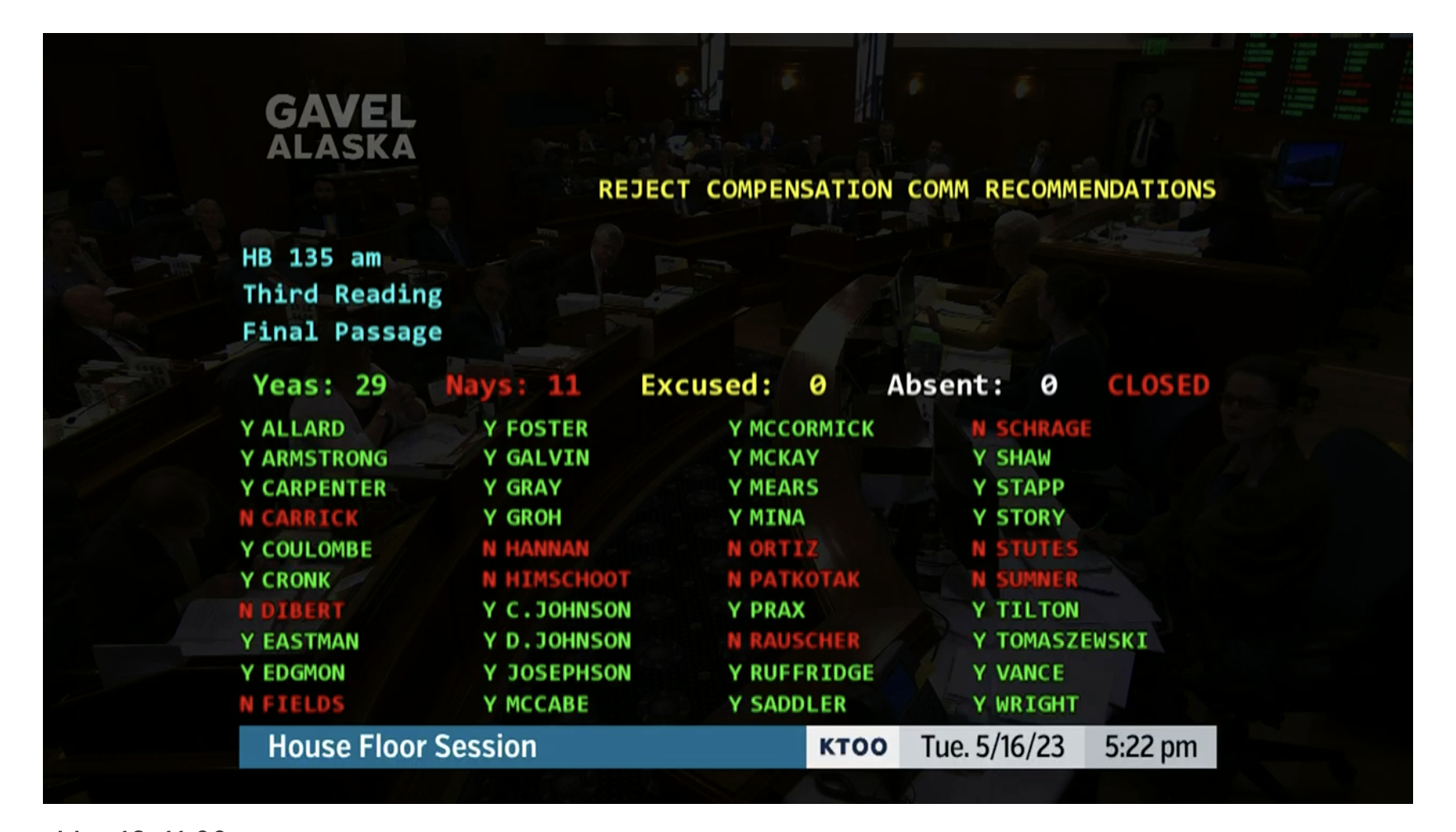 The bill to reject the pay raises reached the House floor on April 3, but House Speaker Cathy Tilton returned it to the House Rules Committee, chaired by Anchorage Rep. Craig Johnson, who sponsored the bill.