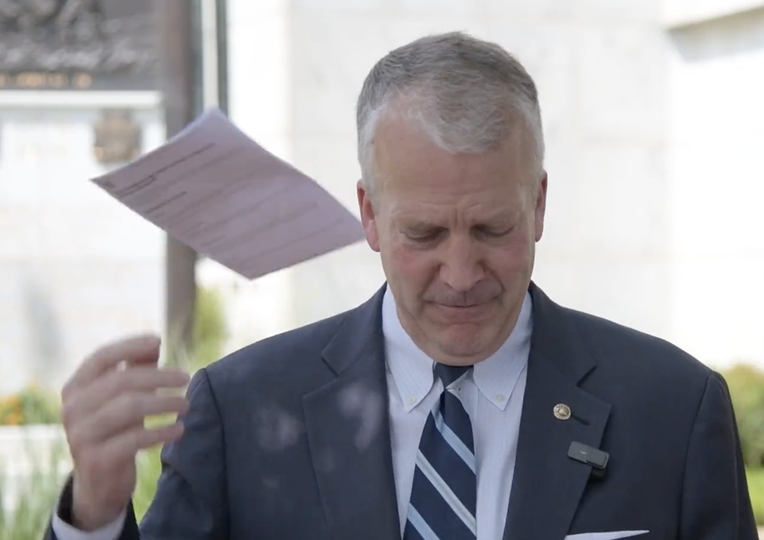 Sen. Dan Sullivan, posing in front of the Washington VFW, complains about news coverage of the defense bill and litters the ground for effect.
