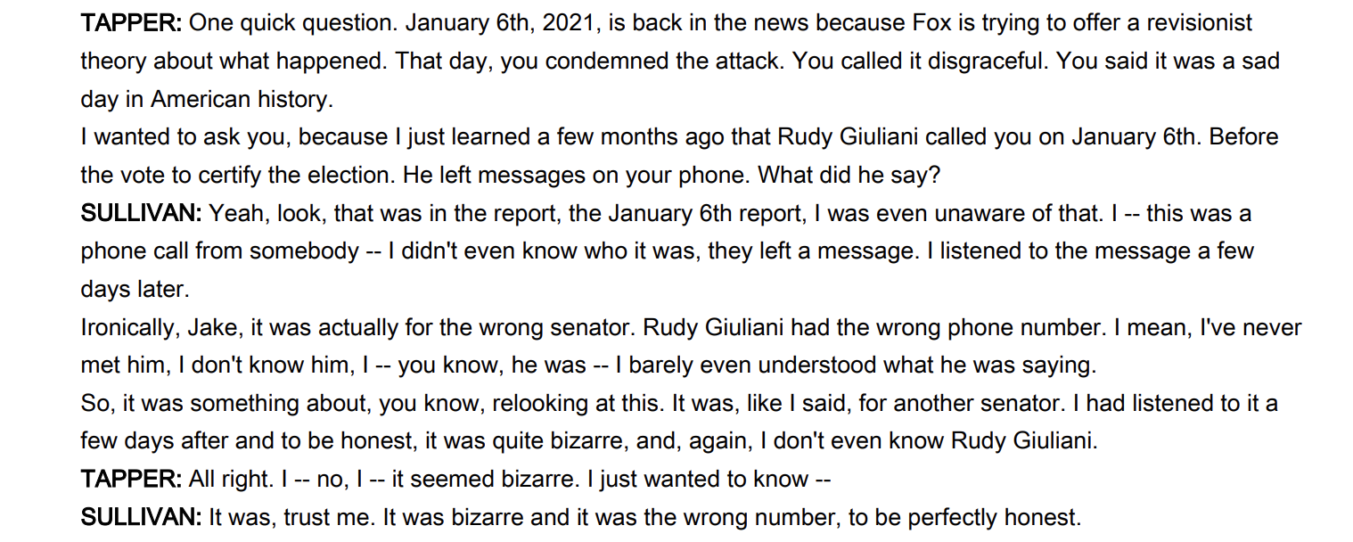On March 7, Jake Tapper of CNN asked Sullivan about the reference in the Jan. 6 report and Sullivan said again that the phone call was not meant for him, but for another senator.