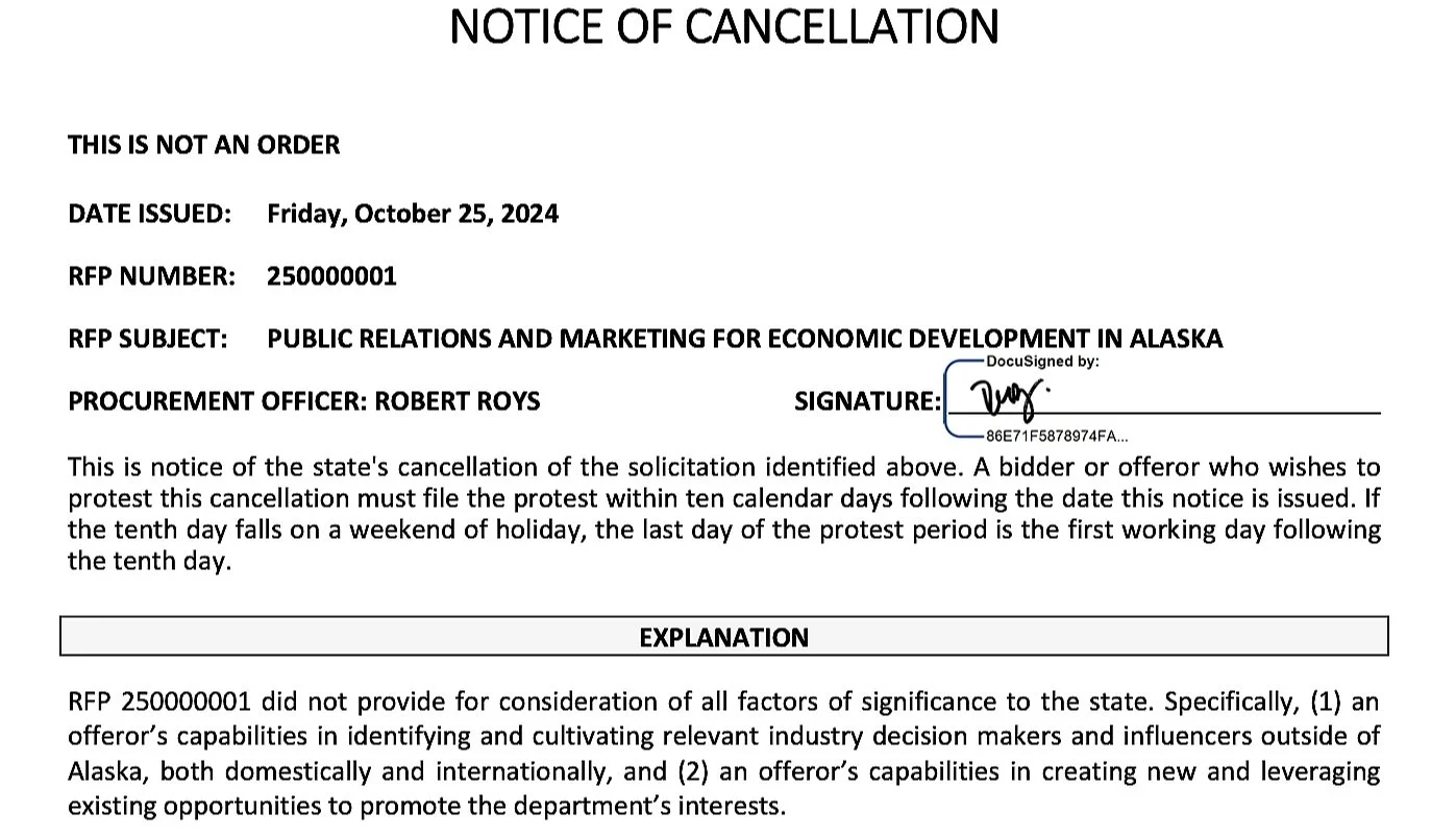 The request for proposals was first issued August 15, with a requirement that firms be at least 10 years old, have “five years or more experience in providing public relations support for Alaskan issues or entities” and three years of “worldwide” experience.