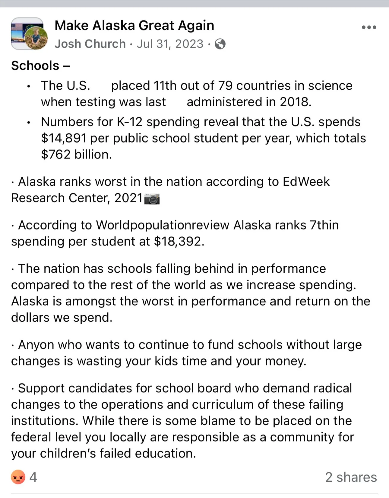 “Support candidates for school board who demand radical changes to the operations and curriculum of these failing institutions,” he wrote on July 31, 2023 on the Make Alaska Great Again Facebook page.