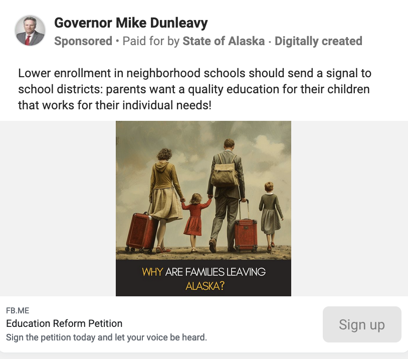 “Sign our petition to support parental rights in Alaska,” Dunleavy says in one of his ads. “Together, we can promote educational options that empower parents and improve learning outcomes for all students.”
