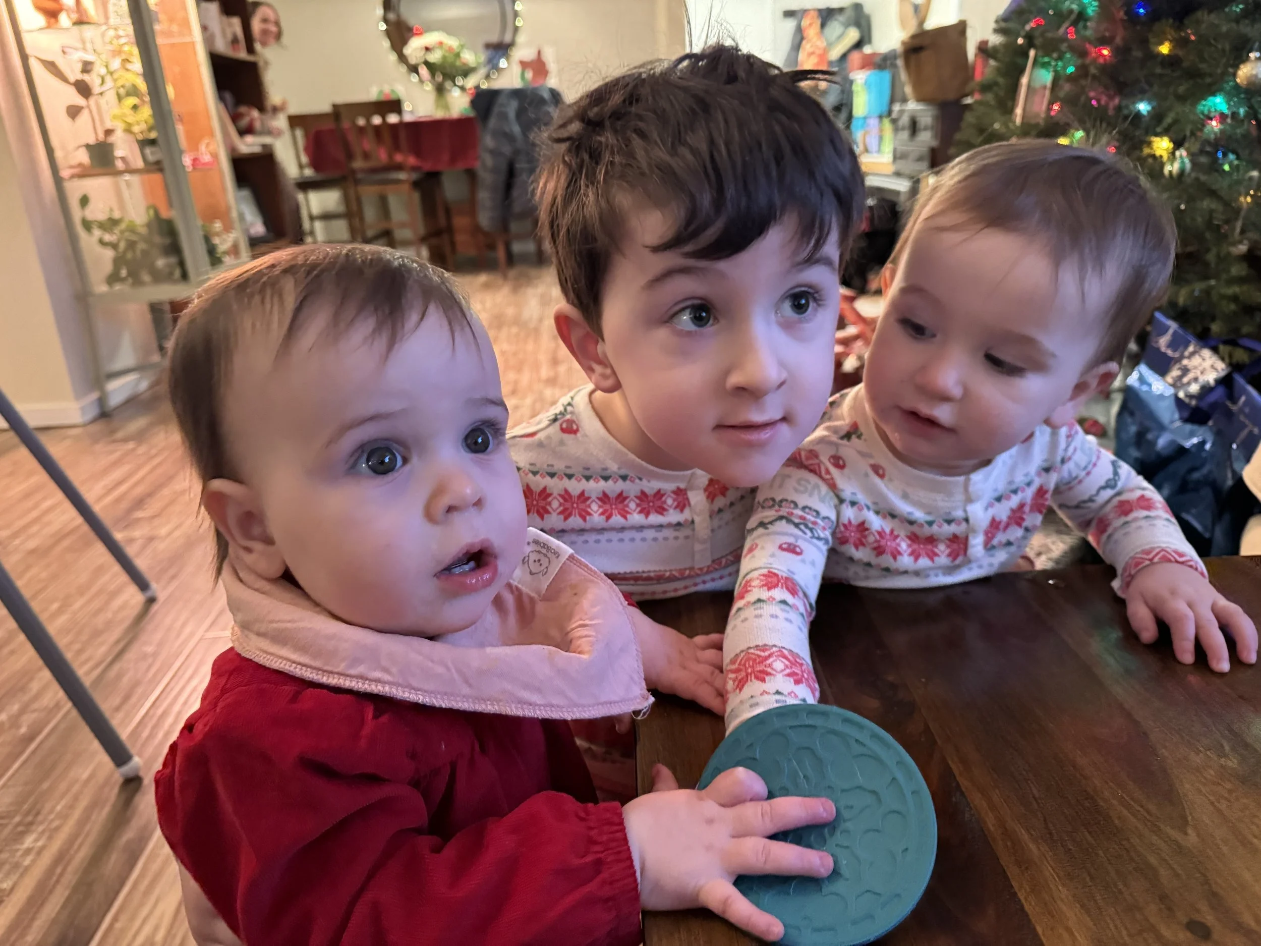 Layla, Robbie and Fiona on Christmas Day. Robbie was the designated “unwrapper” of presents for his sister and cousin.