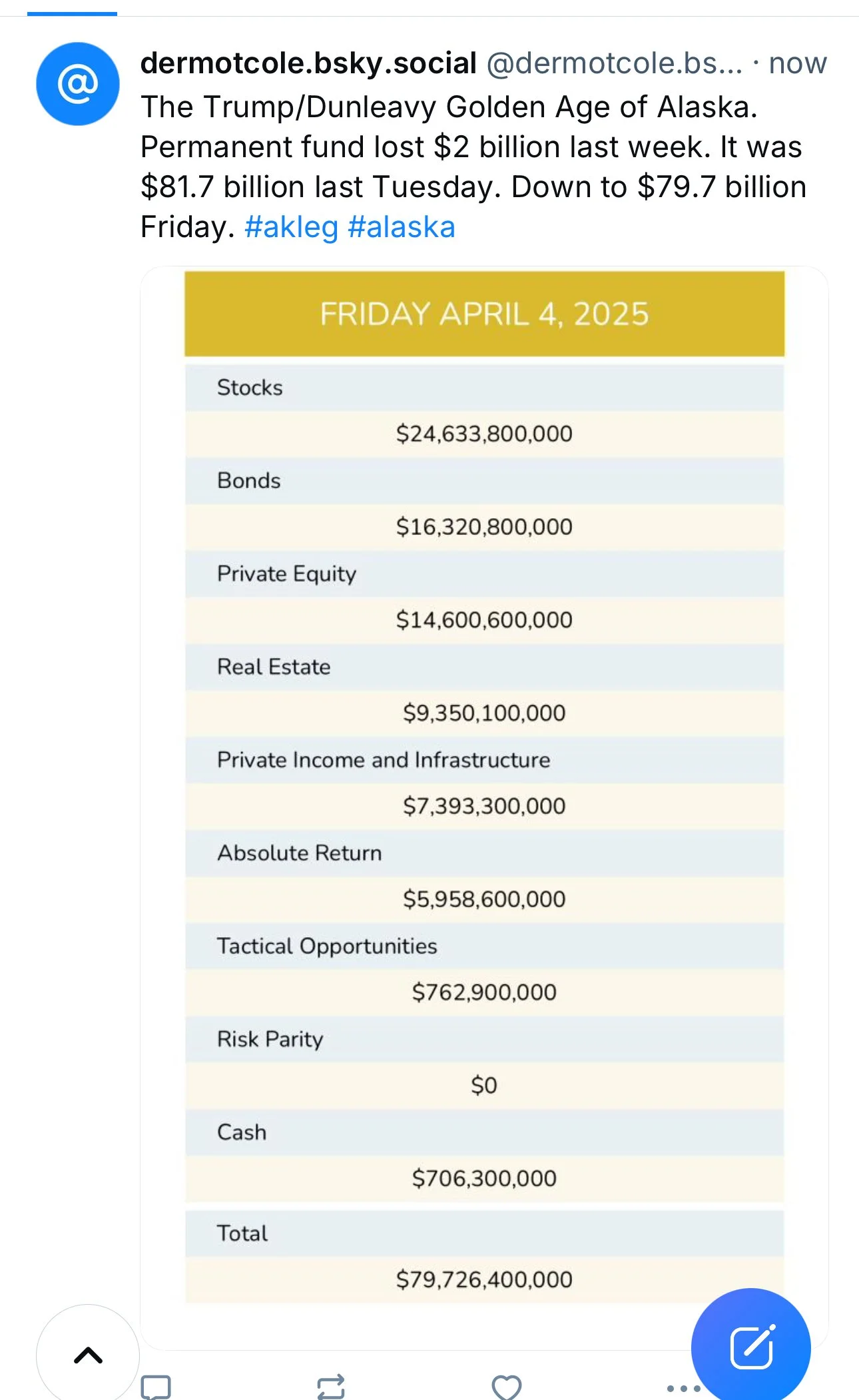 UPDATED: The Alaska Permanent Fund has shed $3.2 billion of market value so far during the Trump Liberation Day stock market crash, dropping from $81.7 billion to $78.5. billion.