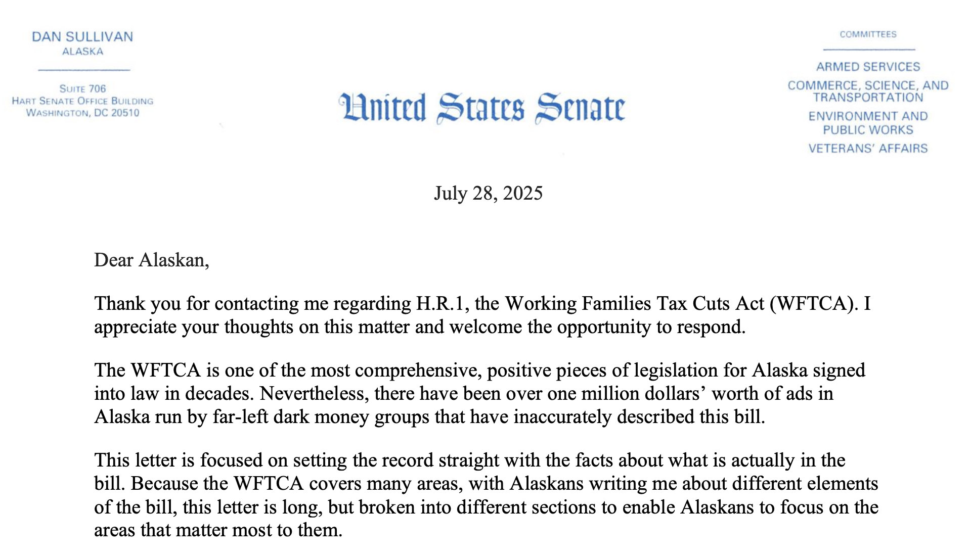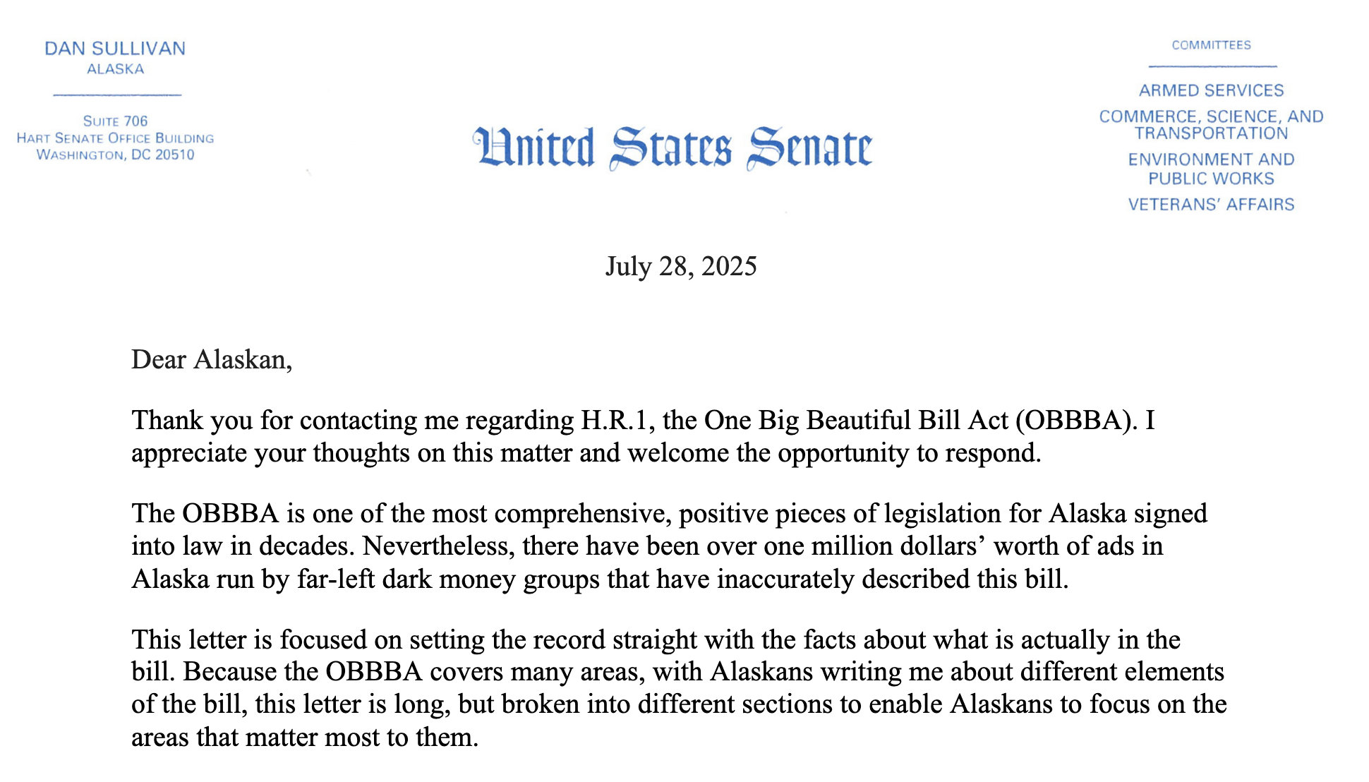 This is the original letter from Sullivan sent to Alaskans defending the Republican One Big Beautiful Bill Act.