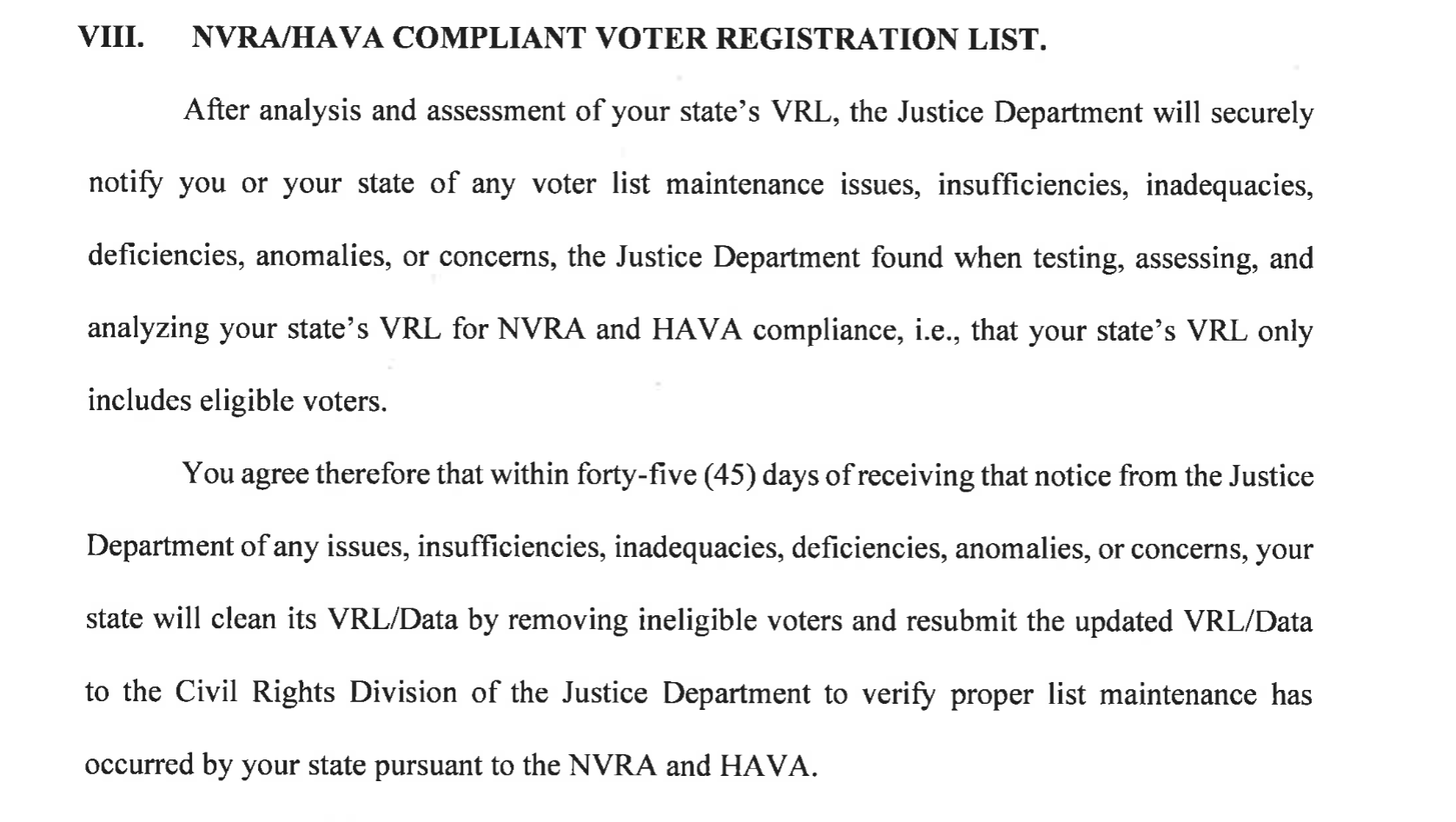 “You agree that within forty-five (45) days of receiving that notice from the Justice Department of any issues, insufficiencies, inadequacies, deficiencies, anomalies, or concerns, your state will clean its VRL/Data (Voter Registration List) by removing ineligible voters and resubmit the updated VRL/Data to the Civil Rights Division of the Justice Department to verify proper list maintenance has occurred by your state,” the memo says about the state’s role.