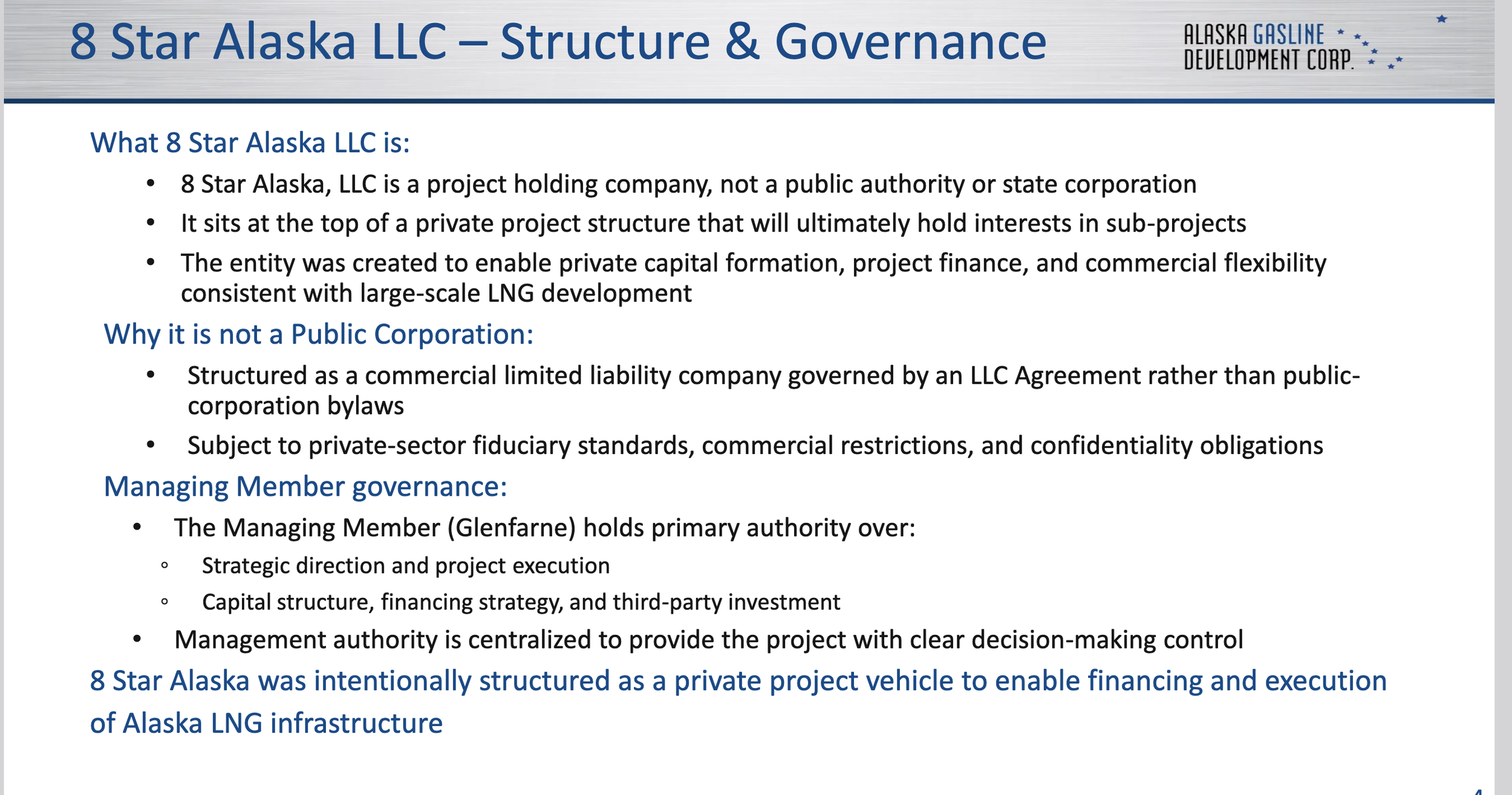 8 Star Alaska is a limited liability company based in Delaware that is now 75 percent owned by Glenfarne Alaska LNG LLC and 25 percent owned by the Alaska Gasline Development Corporation.