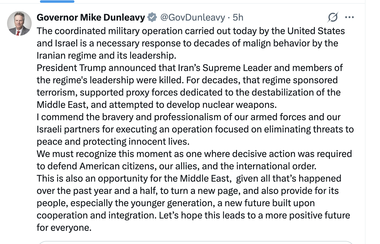 Another uninformed member of the audience, Gov. Mike Dunleavy, who will never stop competing for Trump’s attention, opined that the war is a “necessary response” and required to “defend American citizens, our allies, and the international order.”