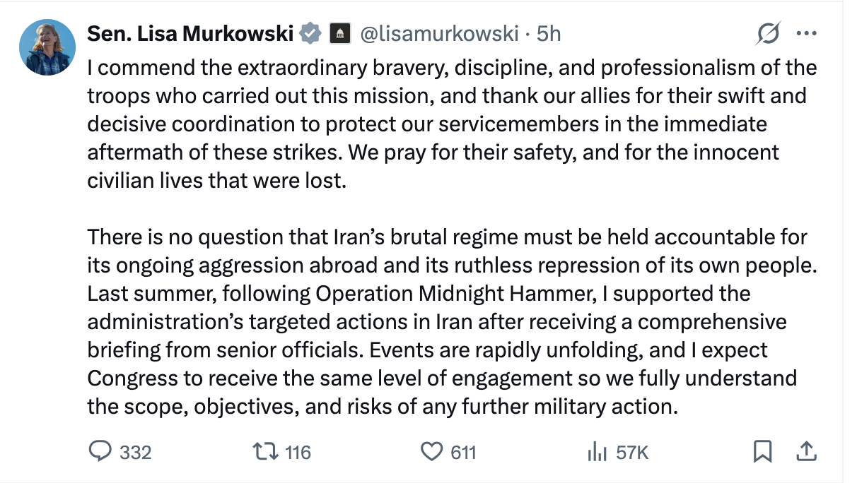 The Republican Congress is not part of this picture, which is something that Murkowski, Sullivan and Begich the Third won’t admit in public, but it’s what they failed to say about Trump’s war that reveals the truth.
