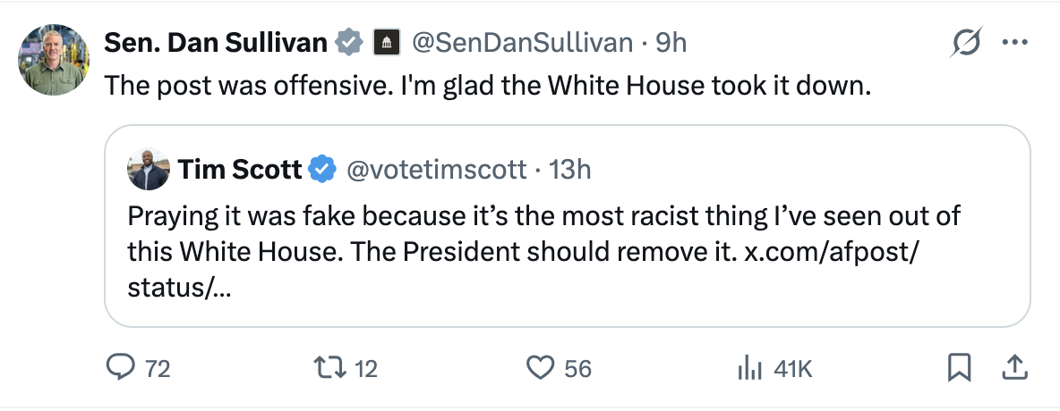 “The post was offensive. I'm glad the White House took it down,” Sullivan posted on his government X/Twitter account Friday, hours after other Republicans—not Sullivan— had demanded that Trump take down his racist attack on former President Barack Obama and his wife Michelle.