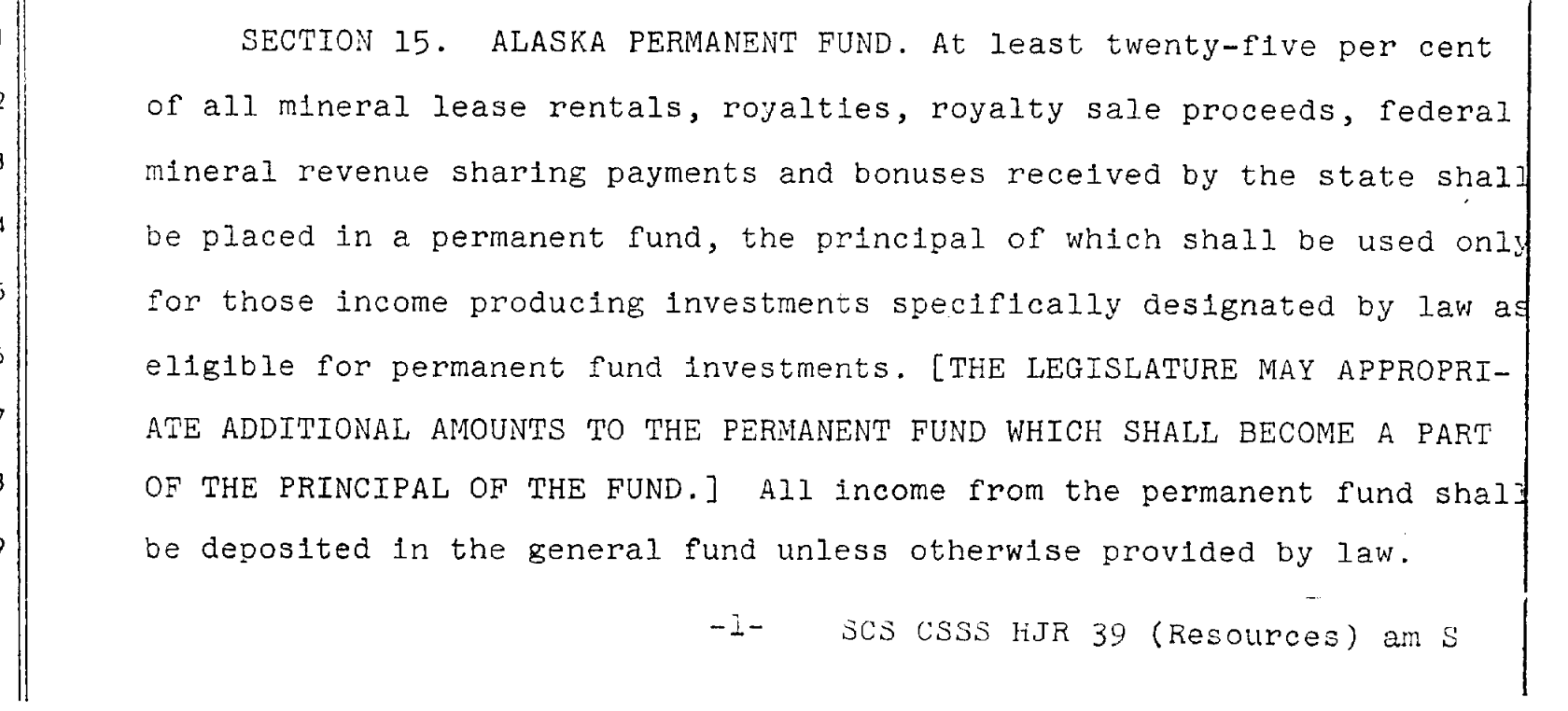 The Senate version of the Permanent Fund amendment that said at least 25 percent of royalties had to be saved for the future. Alaska voters approved this amendment in November 1976. The sentence in all caps was removed from the amendment, but it did not do what Sen. Terry Miller thought. The first two words of the amendment “at least,” made it clear that added amounts could be deposited into the fund.