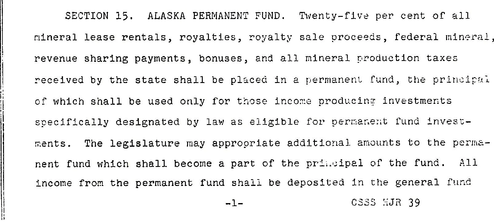 This was the version of the Permanent Fund approved by the House in 1976. The Senate rejected the portion that said “all mineral production taxes” would be saved. The final amendment said at least 25 percent of royalties had to be saved.