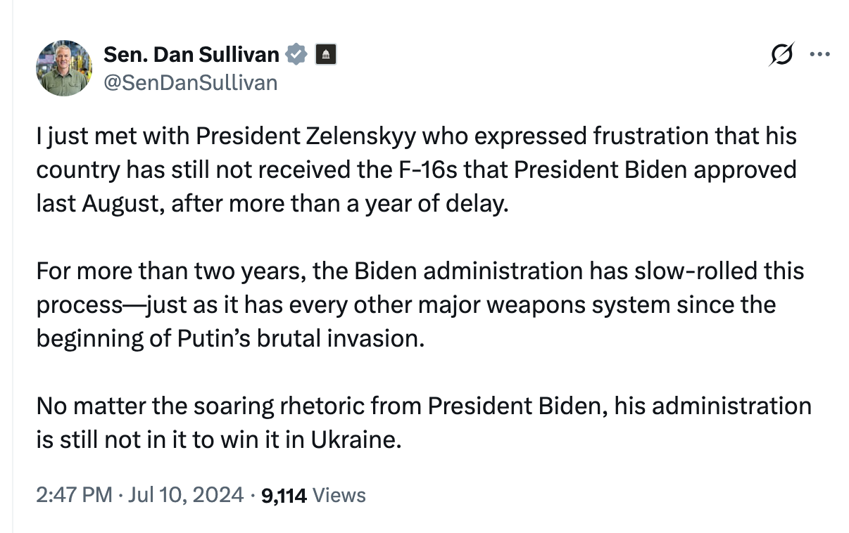 “No matter the soaring rhetoric from President Biden, his administration is not in it to win it in Ukraine,” Sullivan said on July 10, 2024.