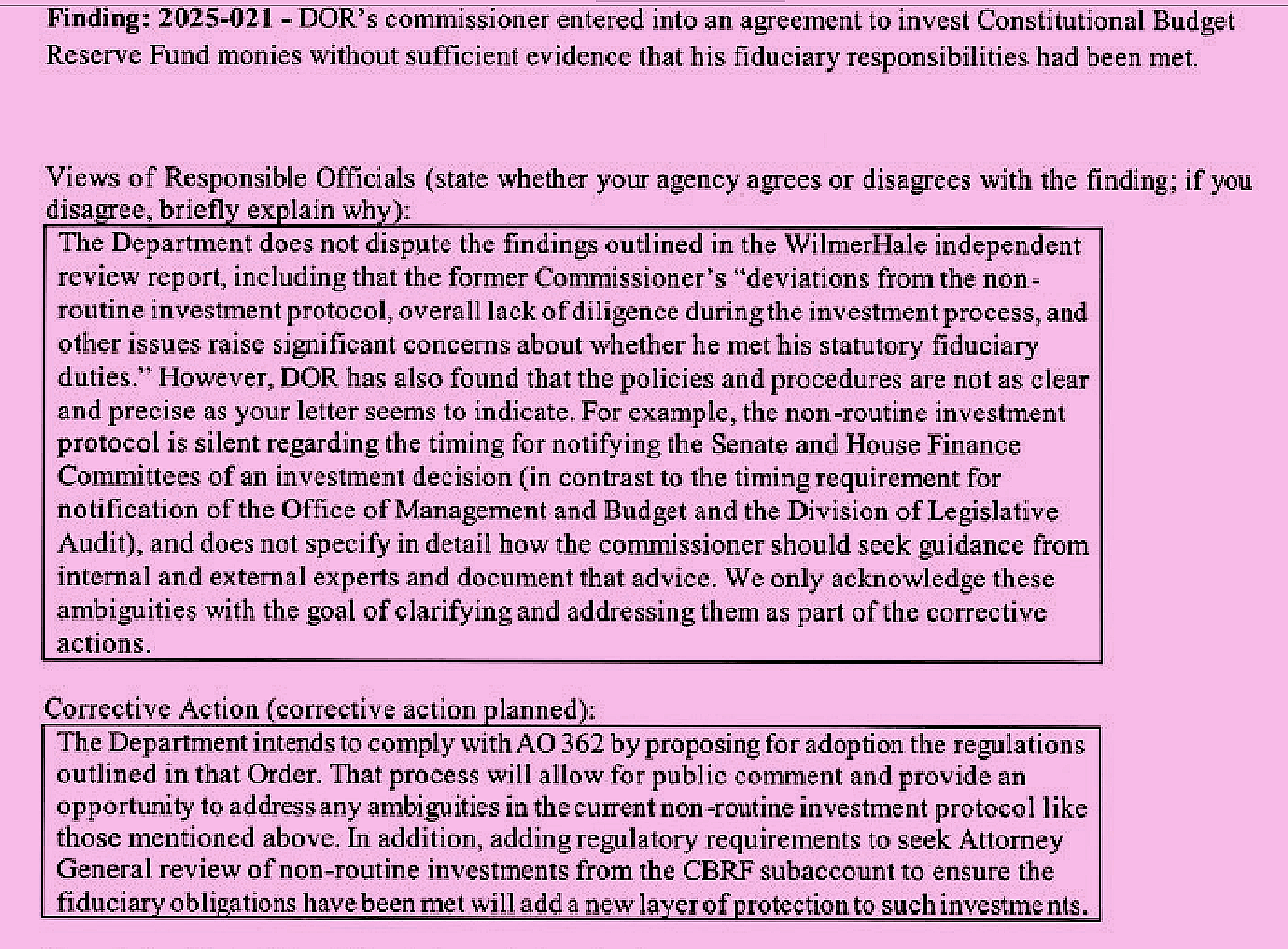 “It is unclear why the commissioner did not follow DOR non-routine investment procedures. A lack of formal oversight of the DOR commissioner’s investment functions contributed to the noted deficiencies,” the audit found.